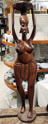 | Kvinnofigur i ädelträ med snidad dekor. Höjd: 87 cm |