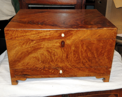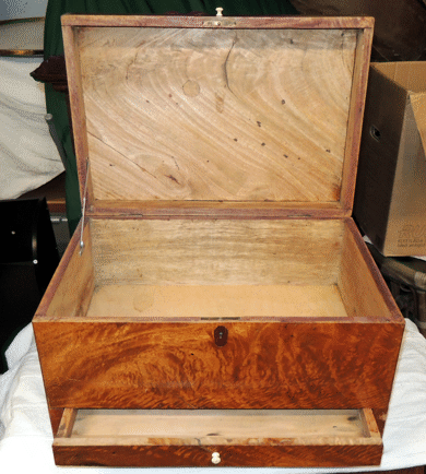 | Skrin i Masurbjörksfaner. Stl: 47 x 33 x 29 cm (Nyckel saknas) |